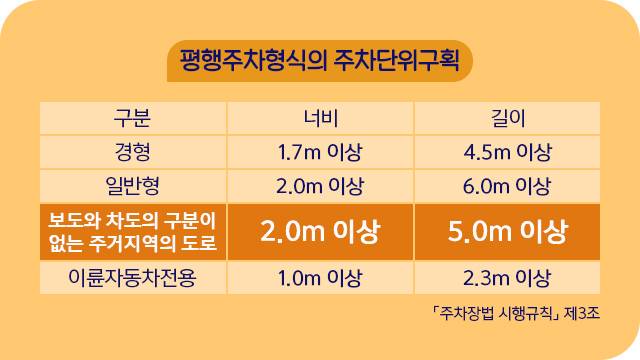 평행주차는 일반적으로 너비 2m, 길이 6m 이상의 주차공간이 필요하다. 그런데 보도와 차도의 구분이 없는 주거지역, 즉 우리가 흔히 볼 수 있는 집 앞 골목의 주차공간은 최소 길이가 5m로 설정되어 있다. 앞서 주차난을 호소했던 친구도 이 경우에 해당한다. 소탐대실은 5m짜리 주차공간에 집중해 더 알아보기로 했다.