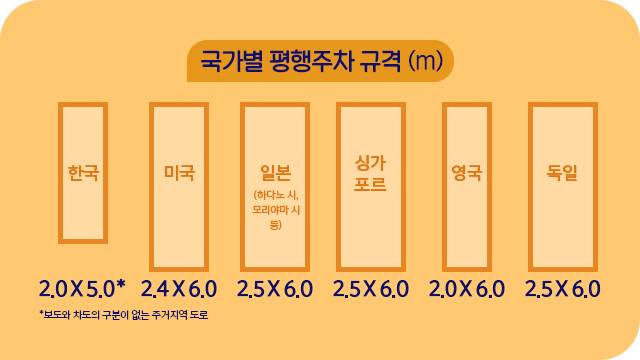 너비는 조금씩 차이를 보였으나 길이는 모두 6m 이상을 권장하고 있었다. 우리보다 경차 비중이 높은 일본, 영국도 평행주차공간을 넓게 구획한 거다.