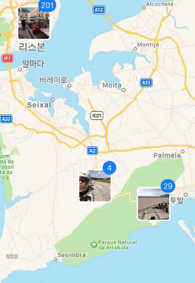 1회에서 말씀드린대로 리스본부터 히구에린하(Figueirinha) 해변까지 왕복 약 190㎞의 시승입니다. 약 30여명의 기자단이 한꺼번에 몰려다닐 수는 없으니까, 3개 그룹으로 나눠 조금씩 거리를 두고 움직이게 됩니다. 지도 속 빨간색 ‘IP7’ 표시가 테주강을 가로지르는 4월25일 다리입니다. 저 곳을 지나 일부 고속도로 구간을 거쳐(토막상식! 대부분의 국가가 이륜차의 고속도로 주행을 허용하고 있습니다) 와인딩 코스와 해변 도로를 거치게 됩니다.
