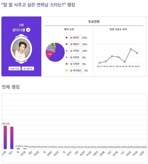 커뮤니티 포털사이트 디시인사이드와 취향 검색 기업 마이셀럽스가 운영 중인 ‘익사이팅디시’가 ‘밥 잘 사주고 싶은 연하남 스타는?’에 대한 투표를 실시한 결과 강다니엘이 1위에 올랐다. 이 투표는 지난 15일부터 21일까지 총 7일간 진행했다.