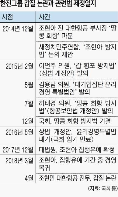한진 일가의 장녀 조현아 칼호텔네트워크 사장은 1999년 대한항공 호텔면세사업본부에 입사한 뒤 6년 만에 대한항공 상무보가 됐다. 장남 조원태 대한항공 대표이사는 2008년 여객사업본부장이 된 후 이듬해 전무를 거처 2013년 부사장이 됐다.
