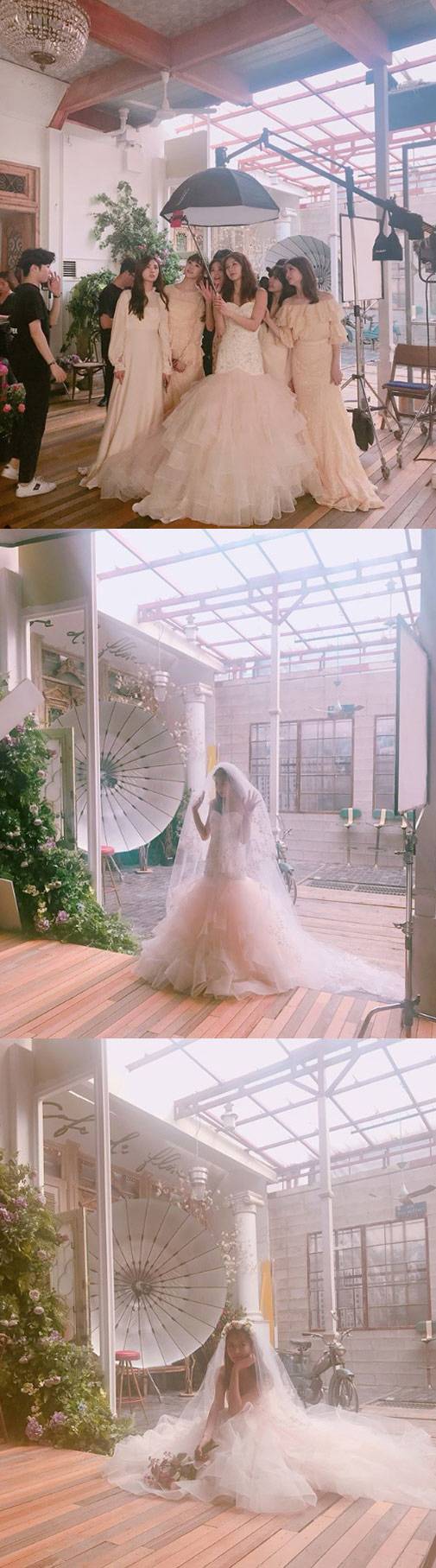 공개한 사진 속에는 정아가 애프터스쿨 멤버들과 함께 웨딩 화보 촬영에 한창인 모습이 담겨 있다.