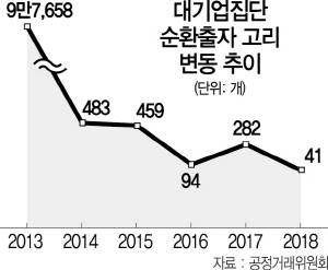 24일 공정위에 따르면 자산 규모 5조원 이상 (준)대기업집단의 순환출자 고리 수는 정부가 신규 순환출자 금지한 2013년 9만7,658개로 정점을 찍은 뒤, 지난해 282개까지 줄었고 올해 4월20일 기준 41개만 남았다.