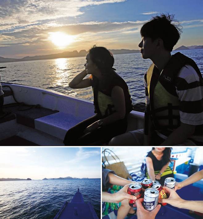 하지만 기대와는 달리 리조트로 가는 길 내내 잔뜩 흐린 날씨였고 간간이 세찬 비가 내리더니 급기야 취소되고야 말았다. 마지막 일정을 마치고 숙소로 돌아오는 길, 이대로 팔라완에서의 마지막 저녁을 보내고 말 것인가? 우리의 결정은 ‘아니올시다!’였다. 모든 게 완벽한 여행은 없다. 이날도 노을을 보기에 그렇게 좋은 날씨였다고 할 수는 없었지만 우리는 방카선(Bangka Boat)*에 몸을 싣고 바다로 나갔다. 배는 섬과 섬 사이에 해가 떨어지도록 가장 좋은 뷰포인트로 이동을 한다.