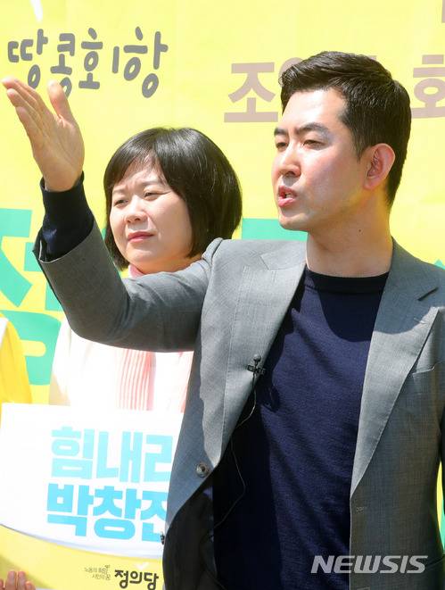 【서울=뉴시스】배훈식 기자 = 25일 오전 서울 강서구 대한항공 본사 앞에서 열린 정의당 정당 연설회에 참석한 박창진 대한항공 사무장이 자신을 감시하는 사측 직원을 발견한 뒤 항의하고 있다. 2018.04.25.