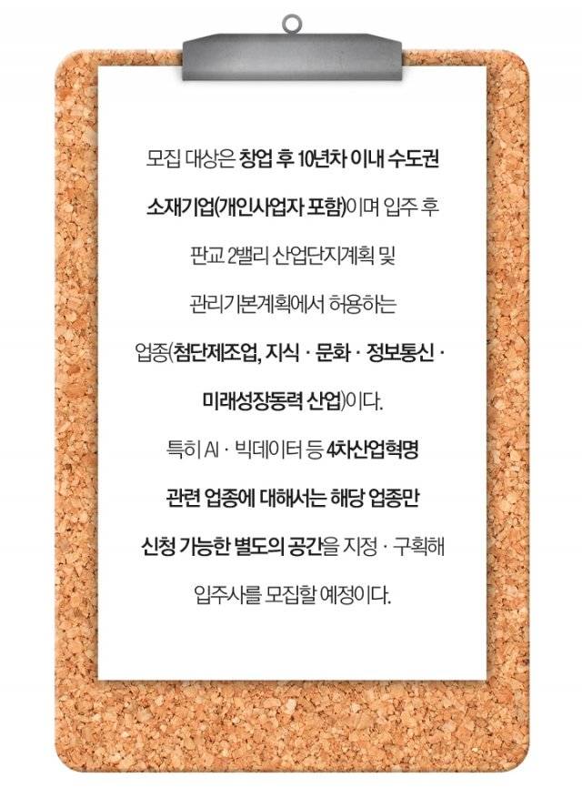 모집 대상은 창업 후 10년차 이내 수도권 소재기업(개인사업자 포함)이며 입주 후 판교 2밸리 산업단지계획 및 관리기본계획에서 허용하는 업종(첨단제조업, 지식·문화·정보통신·미래성장동력 산업)이다. 특히 AI·빅데이터 등 4차산업혁명 관련 업종에 대해서는 해당 업종만 신청 가능한 별도의 공간을 지정·구획해 입주사를 모집할 예정이다.