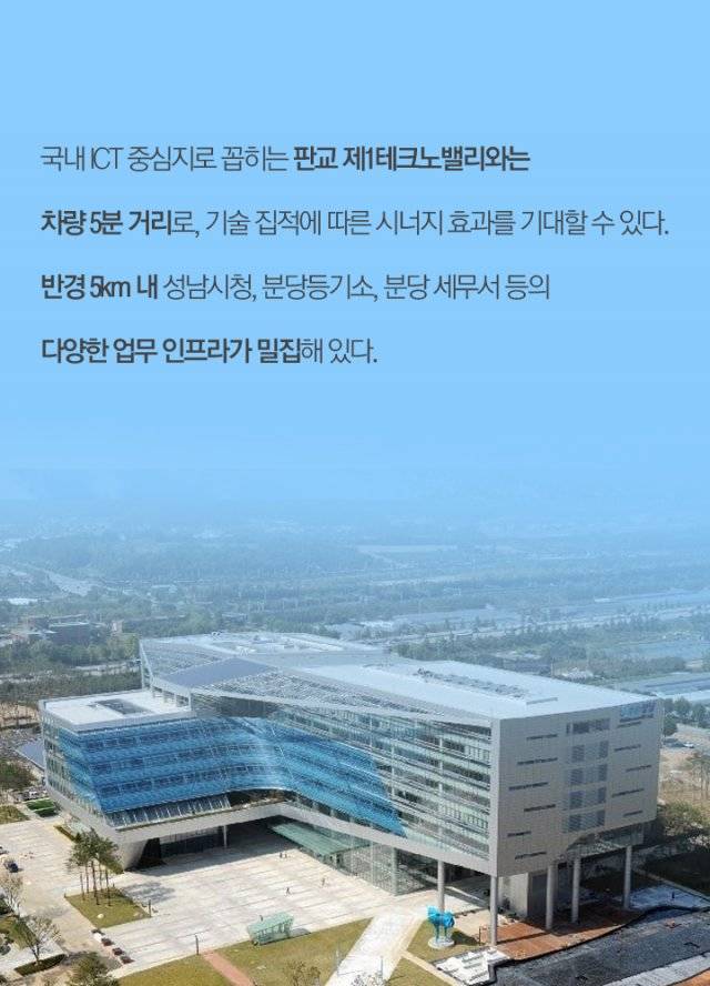 국내 ICT 중심지로 꼽히는 판교 제1테크노밸리와는 차량 5분 거리로, 기술 집적에 따른 시너지 효과를 기대할 수 있다. 반경 5km 내 성남시청, 분당등기소, 분당세무서 등의 다양한 업무 인프라가 밀집해 있다.
