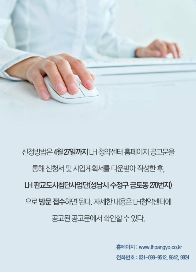 오는 27일까지 LH 청약센터 홈페이지 공고문을 통해 신청서 및 사업계획서를 다운받아 작성한 후, LH 판교도시첨단사업단(성남시 수정구 금토동 270번지)으로 방문 접수하면 된다. 자세한 내용은 LH청약센터에 공고된 공고문에서 확인할 수 있다.