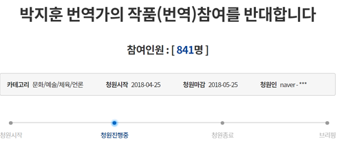 해당 청원인은 "지금까지 영화에서 수많은 오역을 하여 각종 비난과 퇴출운동이 일어나고 있는 문제의 박지훈 번역가의 작품 참여를 반대하고 퇴출을 원한다"고 밝혔다.