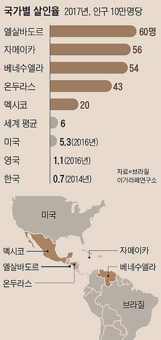 멕시코는 중남미에서 상대적으로 나은 편이다. 브라질 싱크탱크 이가라페연구소에 따르면 지난해 엘살바도르 살인율은 10만명당 60명이었다. 엘살바도르 사망자 10명 중 1명이 살인으로 죽은 셈이다. 자메이카(56명), 베네수엘라(54명), 온두라스(43명)의 살인율도 못지않다. 한국(0.7명), 미국(5.3명), 세계 평균(6명)을 압도한다. 전 세계에서 중남미 인구가 차지하는 비중은 8%인데, 살인으로 죽은 사람의 비중은 38%에 달한다. 영국 주간 이코노미스트는 "작년 한 해 중남미에서 살인으로 14만명 정도가 사망했다"며 "2000년 이후 17년간 전 세계에서 전쟁으로 죽은 전사자 수보다 많은 수치"라고 전했다.