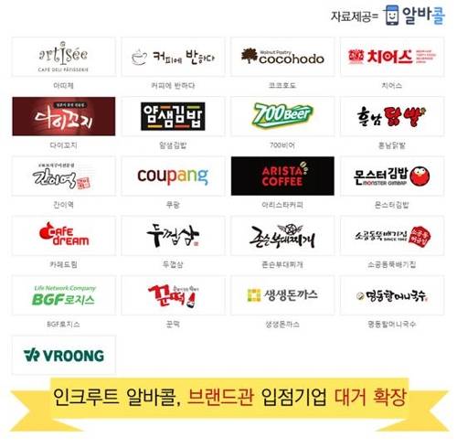 ▲ 취업포털 인크루트가 운영하는 아르바이트(알바) 구인구직 전문앱 알바콜(대표 서미영)은 자사 브랜드관 입점 기업이 21곳으로 대거 확장했다고 27일 밝혔다.