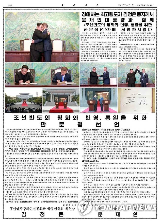(서울=연합뉴스)북한 노동당 기관지 노동신문이 28일 3면에 문재인 대통령과 김정은 북한 국무위원장이 '판문점 선언'에 서명하고 포옹하는 사진과 판문점 선언 전문을 게재한 모습.2018.4.28