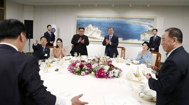 남북정상회담이 열린 27일 문재인 대통령과 김정은 북한 국무위원장은 판문점 선언을 마친 후 가진 만찬에서 시종일관 환한 웃음을 보였다. 북측에서 준비한 평양냉면 외에 마술공연, 남북 가수 합동 공연 등 볼거리도 풍성했다. 환영만찬은 남측의 대표적 국악기인 '해금'과 북의 대표적 악기인 '옥류금'의 합주로 막을 열었고, 가수 윤도현의 공연과 제주에서 온 초등학생 오연준 군의 공연 등으로 화기애애한 분위기를 이어갔다.