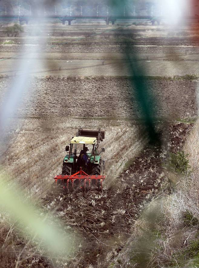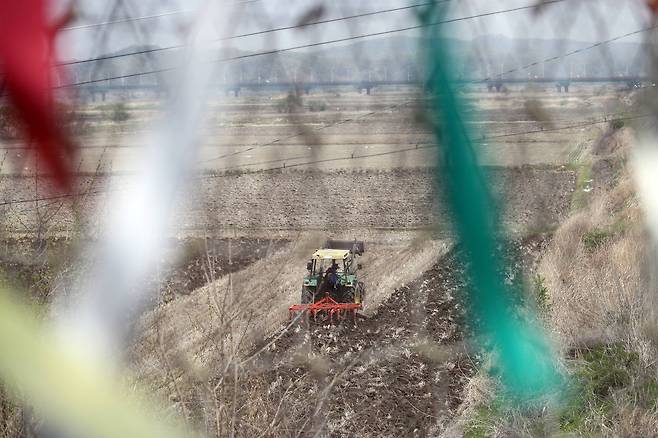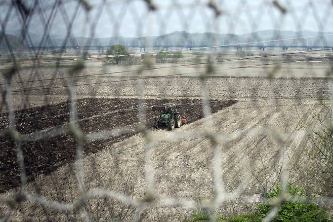 이틀 전에 열린 남북정상회담의 흥분이 채 가라앉지 않은 29일 오전, 북한과 지척인 파주 임진각엔 힘찬 엔진소리가 울려퍼졌다. 바로 앞 철조망 건너 민통선 안에서 농부가 논갈이를 시작했다. 민통선 북쪽 농경지는 분단의 아픔을 상징하기도 하지만 이날은 다른 느낌으로 보였다. 우렁찬 엔진 소리가 통일로 가는 힘찬 시동소리로 들렸기 때문이다. 멀리 보이는 다리는 통일대교다. 문재인 대통령은 27일 아침 저 다리를 건너 판문점으로 달려 가 김정은 북한 국무위원장을 만났다.