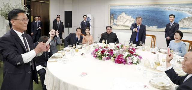 자연스럽게 남북 참석자들은 서로 술잔을 주고받으며 테이블을 오갔다. 청와대 고위 관계자는 “나중엔 지정석도 없이 다들 이곳저곳을 옮겨가며 이야기를 나눴다. 일반적인 정상회담 만찬에서 볼 수 없는 장면인데, 통역이 필요 없기에 가능했던 것 같다”고 전했다.