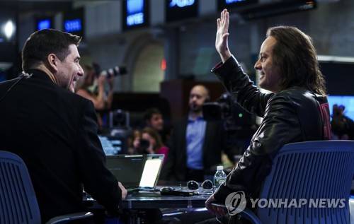epa06702576 Marcelo Claure (L), the CEO of Sprint, and John Legere, the CEO of T-Mobile, give each other a high five will being interviewed about T-Mobile's proposed buyout of Sprint at the New York Stock Exchange in New York, New York, USA, 30 April 2018. Reports state that, T-Mobile and Sprint on 29 April 2018 announced plans to merge in a deal valued at some 146 billion US dollars. The deal that will face regulatory scrutiny by US authorities, would combine the third and fourth largest US wireless carriers and have some 127 million subscribers. EPA/JUSTIN LANE