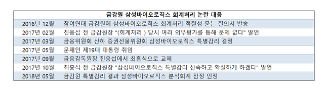 금융감독원이 삼성바이오로직스에 대한 특별감리 결과 분식회계가 인정된다는 결론을 내렸다. 1년 3개월전 진웅섭 전 금감원장이 삼성바이오로직스의 회계처리에 문제가 없다는 발언과 정반대의 결과다. 금감원의 입장이 변하는 사이, 장미대선에서 승리한 문재인 대통령은 제19대 대한민국 대통령으로 취임했다.