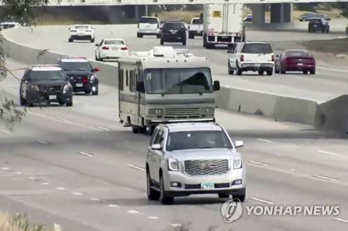 In this frame Tuesday, May 1, 2018 video provided by 23-ABC-TV Bakersfield, police chase an RV along a north bound highway in Kern County, Calif. A paroled sex offender drove the motor home and gave police the slip after a 3.5-hour chase through California by turning into an almond orchard and disappearing into a cloud of dust kicked up by his vehicle. (23-ABC-TV Bakersfield via AP)