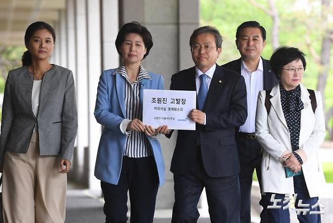 더불어민주당 송기헌 법률위원장과 백혜련, 김현 대변인 등이 3일 오후 태극기 집회에서 문재인 대통령에게 욕설을 한 대한애국당 조원진 공동대표를 허위사실 명예훼손 혐의로 고발하기 위해 서울 서초동 중앙지검으로 고발장을 들고 들어서고 있다.