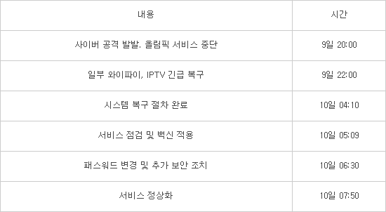 올림픽 CERT는 즉각 응급 피해 복구 체계를 가동했다. 개막식 종료 후 숙소와 미디어센터로 돌아가는 인원을 생각해서 일부 와이파이와 IPTV를 복구했다. 밤 10시였다. 이튿날 새벽까지 비상은 이어졌다. 당장 10일 오전 9시부터 동계올림픽 경기가 시작되기 때문이다. 10일 새벽 4시 10분, 조직위와 CERT가 협조해 시스템 복구를 완료했다.