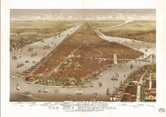 “조감도는 남쪽에서부터 비슷한 관점으로 뉴욕 시와 브루클린을 묘사하고 있다. 배터리 파크가 앞쪽에 있고, 저지(Jersey) 해안이 왼쪽 상단에 있으며, 윌리엄스버그(브루클린)가 오른쪽 하단에 있는 점도 같다. … 1884년의 것(위쪽)은 커리어 앤드 아이브스 회사가 그린 것이다. 뉴욕에서 이름난, 적갈색 사암(브라운 스톤)으로 지은 주택들이 1865년에 이미 분명하게 보인다. 눈에 띄게 두드러진 모습은 바로 1883년에 개통된 브루클린 다리다.”