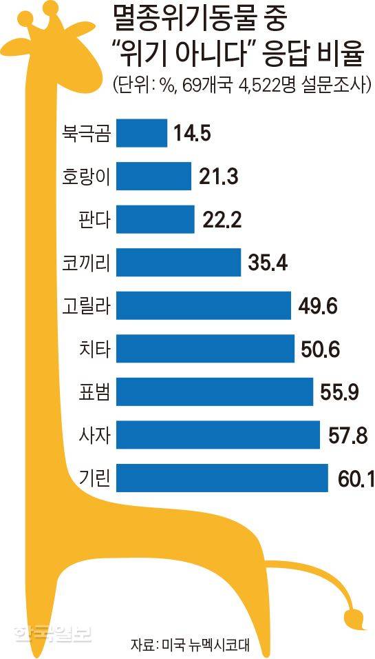 사자의 개체수 역시 최대 규모의 8%에도 못 미친다. 인도에 사는 아시아사자는 고작 175개체만 남았다. 인류가 개발에 나서면서 표범은 서식지의 75%를 잃어버렸고, 9개 아종 모두 멸종위기에 처해 있다. 연구진은 “멸종위기동물을 회사 로고나 제품 광고에 쓰는 경우가 많은데, 이러한 익숙함은 사람들에게 정작 이들 동물이 처한 상황을 잊게 만든다”고 지적했다. 실제 연구진이 전 세계 69개국 4,522명에게 익숙한 대표 멸종위기동물들이 사라질 위험에 처해있는지 물어본 결과, “아니요”라고 답한 비율이 기린은 60.1%, 사자 57.8%, 표범 55.9%, 고릴라 49.6%에 달했다.