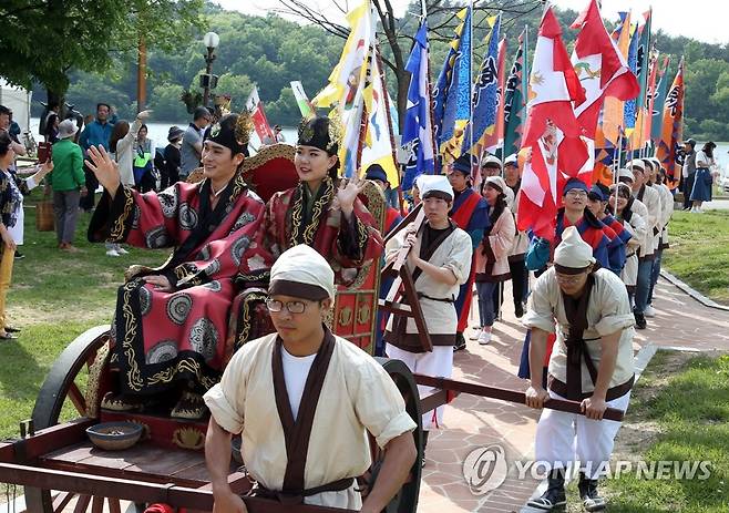 (익산=연합뉴스) 백제 서동과 신라 선화공주의 사랑을 주제로 전북 익산시 금마면 서동공원 일대에서 열리는 익산서동축제에서 지난 5일 백제 무왕 행차가 재연되고 있다. 2018.5.6 [익산시 제공=연합뉴스]