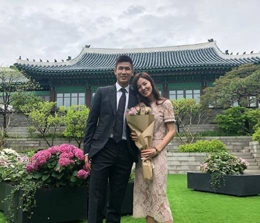 김성은은 6일 자신의 인스타그램에 "오랜만에 신랑과 투샷!"이라는 문구와 함께 남편 정조국으로부터 선물로 받은 듯한 꽃다발을 들과 나란히 찍은 사진을 게재했다.