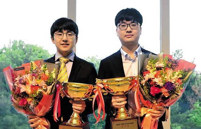세계 '속기 챔피언'은 김지석(29·사진 왼쪽)이었다. 4일 서울 메이필드호텔서 막을 내린 제30회 TV바둑아시아선수권대회 결승서 김 9단은 전기 우승자 나현(23·오른쪽) 9단에게 백으로 2집 반 승, 정상에 올랐다. 이에 앞서 중국 판윈러와 톱스타 박정환을 넘어 결승 고지를 밟았었다. 김지석의 통산 우승 횟수는 7회, 그중 국제대회는 2014년 삼성화재배 포함 2회로 늘어났다.
