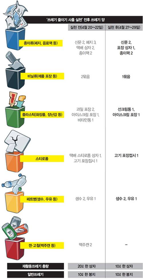 기자 역시 쓰레기 대란이 발생한 4월 초, 집 안에 쌓여가는 쓰레기를 보면서 국민 한 사람으로서 쓰레기 줄이기에 동참하지 않으면 궁극적으로 문제가 해결되지 않으리란 생각에 직접 실천해보기로 했다. 기자와 남편, 그리고 6세, 3세 딸아이가 있는 4인 가구로 쓰레기가 가장 많이 배출되는 금요일부터 일요일까지 사흘을 실험 기간으로 정했다. 쓰레기 줄이기 실천 첫 주인 4월 20일부터 22일까지는 평소대로 생활하고, 일주일 뒤인 4월 27일부터 29일까지는 최대한 쓰레기를 줄여보기로 했다.