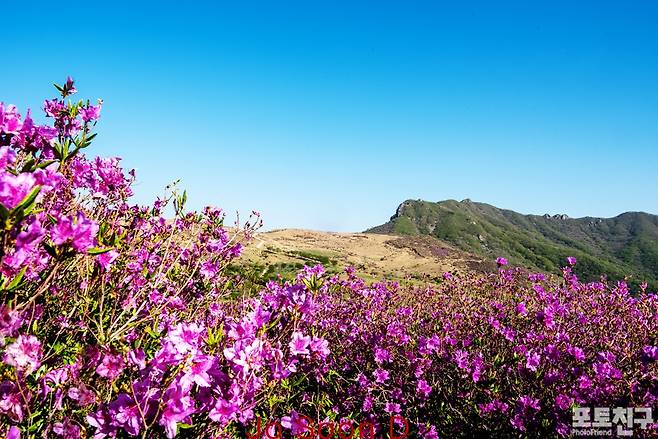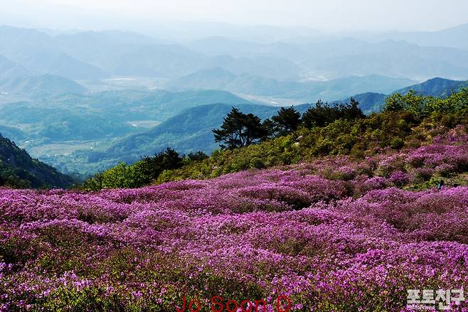 경남 산청군에 위치한 황매산의 5월은 철쭉으로 뒤덮여 온통 분홍빛이다.