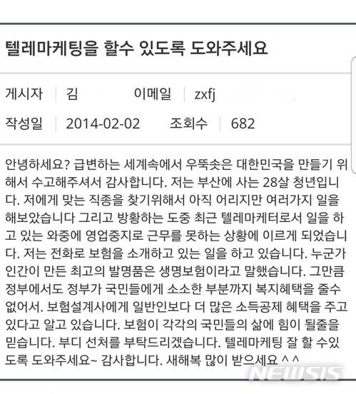 실제로 지난 2014년 국민권익위원회 홈페이지에는 김씨로 추정되는 'zxfj'라는 아이디가 "텔레마케터로 일을 하는 와중에 영업 중지로 근무를 못하는 상황에 이르게 됐다"면서 "선처를 부탁하며 텔레마케팅을 잘 할 수 있도록 도와달라"는 내용의 글을 올리기도 했다.