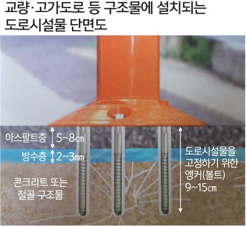 문제는 구멍을 뚫고 앵커(볼트)로 고정해 시설물을 설치하다 보면 어떤 식으로든 구조물의 안전성을 해칠 수밖에 없다는 점이다. 일반 도로의 경우 아스팔트 표층을 뚫더라도 밑에 지면이 받치고 있어 아스팔트 수명 단축 외에 당장 안전상 문제가 발생하는 건 아니다.