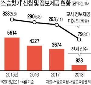 하지만 연락처 통보를 거부하는 교사가 점차 늘어나 10%에 육박하고 있다. 서울에선 1~4월 928건의 스승찾기 신청이 접수돼 8.5%인 79건이 교사의 정보 제공 미동의로 거부됐다. 2015년 5.8%에 비해 월등히 높은 거부율이다.