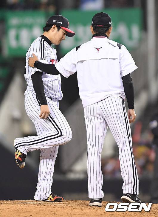 8회초 1사 1루 LG 김지용이 통증을 호소해 트레이너와 이야기를 나누고 있다. / youngrae@osen.co.kr