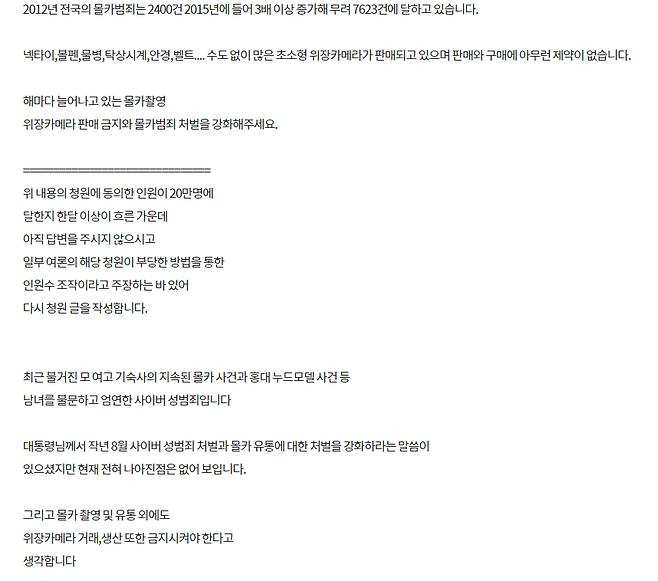 이 청원인은 "(몰카 관련) 청원에 동의한 인원이 20만 명에 달한 지 한 달 이상이 흐른 가운데 아직 답변을 주시지 않았다"며 "일부가 해당 청원이 부당한 방법을 통한 인원수 조작이라고 주장하는 바 있어 다시 청원 글을 작성한다"고 같은 청원을 다시 올리는 이유를 밝혔다.