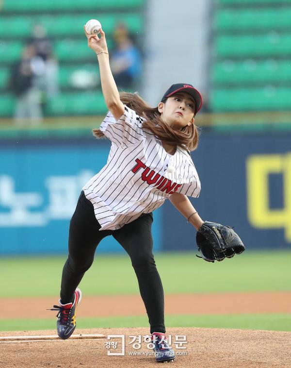 걸그룹 에이핑크 윤보미가 10일 서울 잠실야구장에서 열린 2018 신한은행 마이카 KBO리그 LG 트윈스와 롯데 자이언츠의 경기에서 시구를 하고 있다. 2018.05.10