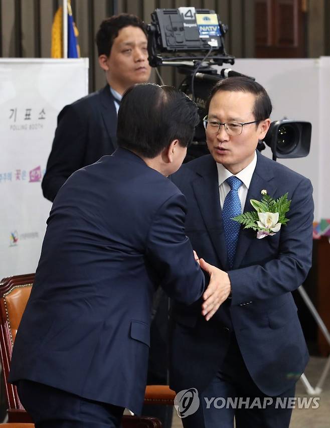 (서울=연합뉴스) 김주형 기자 = 11일 오전 국회에서 열린 더불어민주당 신임 원내대표에 선출된 홍영표 의원이 노웅래 의원에게 축하를 받고 있다. 2018.5.11