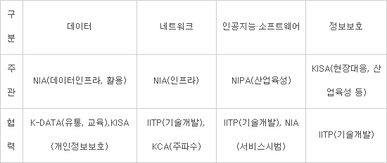데이터는 NIA가 주관기관으로 인프라와 활용을, 한국데이터진흥원(K-DATA)과 한국인터넷진흥원(KISA)는 각각 협력기관으로 데이터 유통·교육, 개인정보보호를 담당한다.