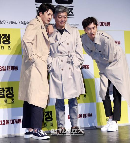 배우 권상우, 성동일, 이광수가 17일 오전 서울 강남구 CGV 압구정점에서 열린 영화 '탐정:리턴즈' 제작보고회 포토타임에서 포즈를 취하고 있다.