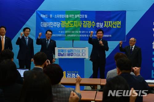 【창원=뉴시스】김기진 기자 = 17일 직능경제인단체총연합회 등120여 직능 중·소 자영업단체는 경남 창원에 소재한 김경수 더불어민주당 후보 선거 캠프에서 김경수 후보 지지선언을 했다. 사진은 김진표(오른쪽에서 두번째) 민주당 전 원내대표가 직능단체 대표들이 모인 가운데 김 후보 지지를 외치고 있는 모습. 2018.05.17.