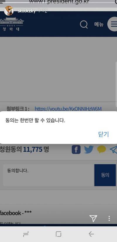 17일 수지는 자신의 인스타그램 스토리를 통해 ‘합정 XXXX 불법 누드촬영’ 청와대 국민청원에 동의하는 영상을 공개했다.