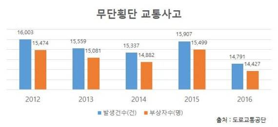 최근 5년간 무단횡단 사고의 치사율은 5.33%로 정상 횡단보다 약 1.5배 위험한 것으로 나타났다. 2012년부터 2016년까지 무단횡단 사고는 7만7597건이 발생해 4134명이 숨졌다. 정상 횡단 시 치사율은 이보다 낮은 3.50%다. 같은 기간 14만3098건이 발생했고 5004명이 숨졌다.