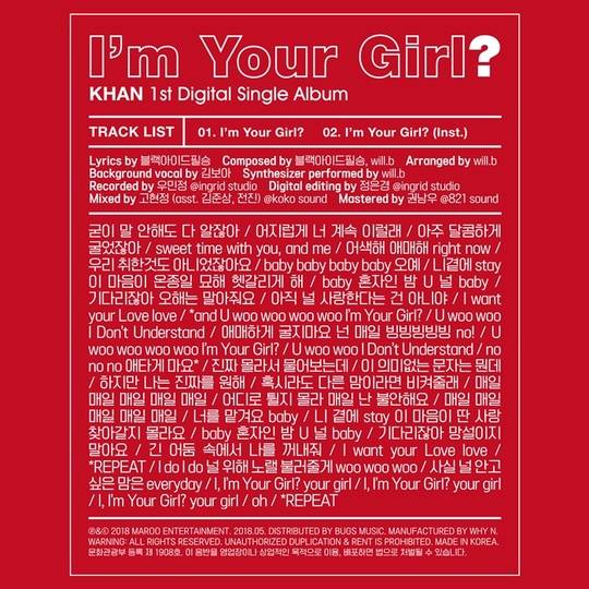 함께 공개된 가사 스포일러 이미지에는 곡 작업에 참여한 뮤지션 및 엔지니어들의 이름이 적힌 크레딧과 더불어 ‘I’m Your Girl ? ’의 전체 노랫말이 담겨 있다. 음원 하이라이트와 마찬가지로 강렬한 레드톤 컬러의 배경 위 흰색 텍스트로 가사 및 크레딧을 표기하며 네티즌들의 눈길을 끌었다.