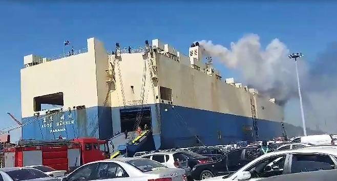 이 화물선에는 리비아로 갈 예정인 수출용 중고차 200여대가 실렸던 것으로 알려졌다. 인천소방본부에 따르면 인명피해는 발생하지 않았다. 2018.5.21 [인천소방본부 제공=연합뉴스]