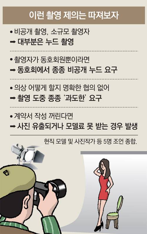 경찰과 해당 업계에 따르면 비공개로 누드를 주로 촬영하는 스튜디오는 전국에서 10곳 안팎이다. 신체 노출이 많은 사진을 제안하는 경우 대부분 “유출하지 않고 개인 소장용”이라는 취지로 계약서를 쓴다. 모델료는 천차만별이다. 이름이 알려지지 않았으면 1시간에 10만∼20만 원이지만 인지도가 꽤 있으면 수백만 원까지 받는다. ‘누드 화보 촬영에 100만 원을 달라’는 모델의 글이 오르기도 한다.