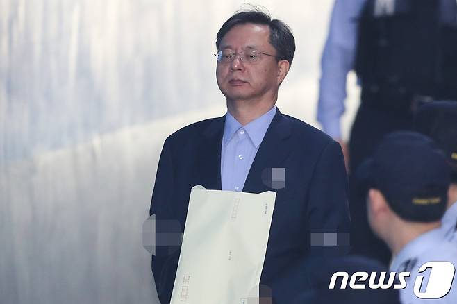(서울=뉴스1) 성동훈 기자 = 국정원 불법사찰 등으로 기소된 우병우 전 청와대 민정수석이 23일 오전 서울 서초구 서울중앙지방법원에서 열린 직권남용권리행사방해 등 속행 공판에 출석하고 있다. 2018.5.23/뉴스1