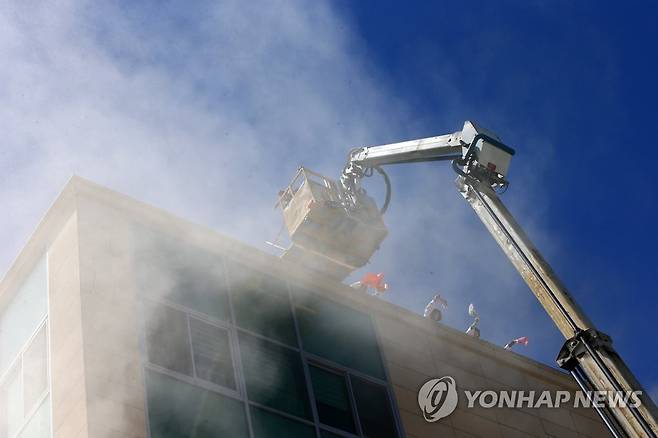 (속초=연합뉴스) 이종건 기자 = 23일 속초 정요양병원에서 시행된 2018 재난대응 안전한국 훈련에서 옥상으로 대피한 환자와 직원들을 구조하는 훈련이 전개되고 있다.
