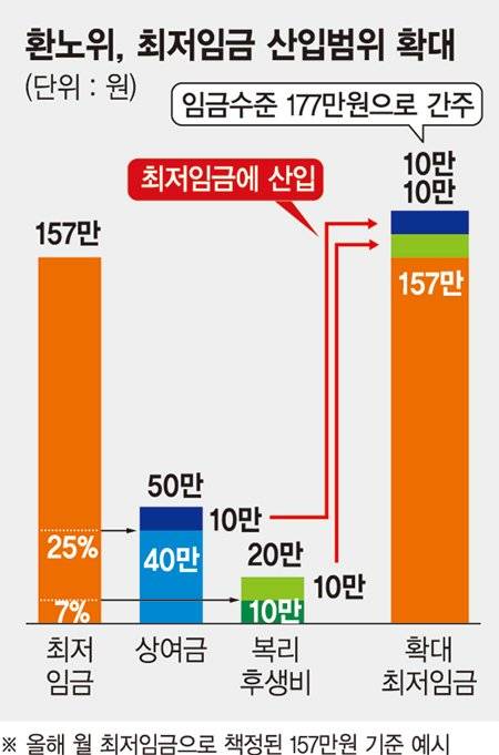 올해 월 최저임금으로 책정된 157만원(시급 7530원×209시간)을 기준으로 매월 상여금이 39만3000여원(25%)를 넘으면 최저임금에 포함되는 것이다. 복리후당 수당도 월 11만원(7%)을 넘어서면 최저임금에 포함된다. 이에 따라 연 2500만원 안팎의 저임금 노동자는 산입범위 확대 대상이 되지 않는다. 다만 상여금과 복리후생 수당은 오는 2024년 100% 산입을 목표로 해마다 기준치를 줄여 나가기로 했다.