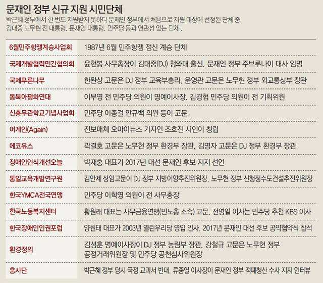 민주당 의원들과 연결된 단체도 곳곳에 있었다. 한국YMCA전국연맹은 박근혜 정부 때 한번도 지원받지 못하다가 이번에 처음 정부 지원을 받았다. 민주당 이학영 의원이 2003년부터 19대 국회의원이 되기 직전인 2011년까지 이 단체의 사무총장을 지냈다. 신규 지원 대상인 동북아평화연대는 이부영 전 의원이 명예이사장을 맡고 있다. 민주당 김경협 의원이 이 단체 기획위원으로 근무하다 노무현 정부의 청와대에 입성했다. 신흥무관학교기념사업회는 ‘항일음악회 다시 부르는 희망의 노래’로 신규 선정됐는데 이 단체의 고문단에는 민주당 이종걸 안규백 의원이 포함돼 있다.